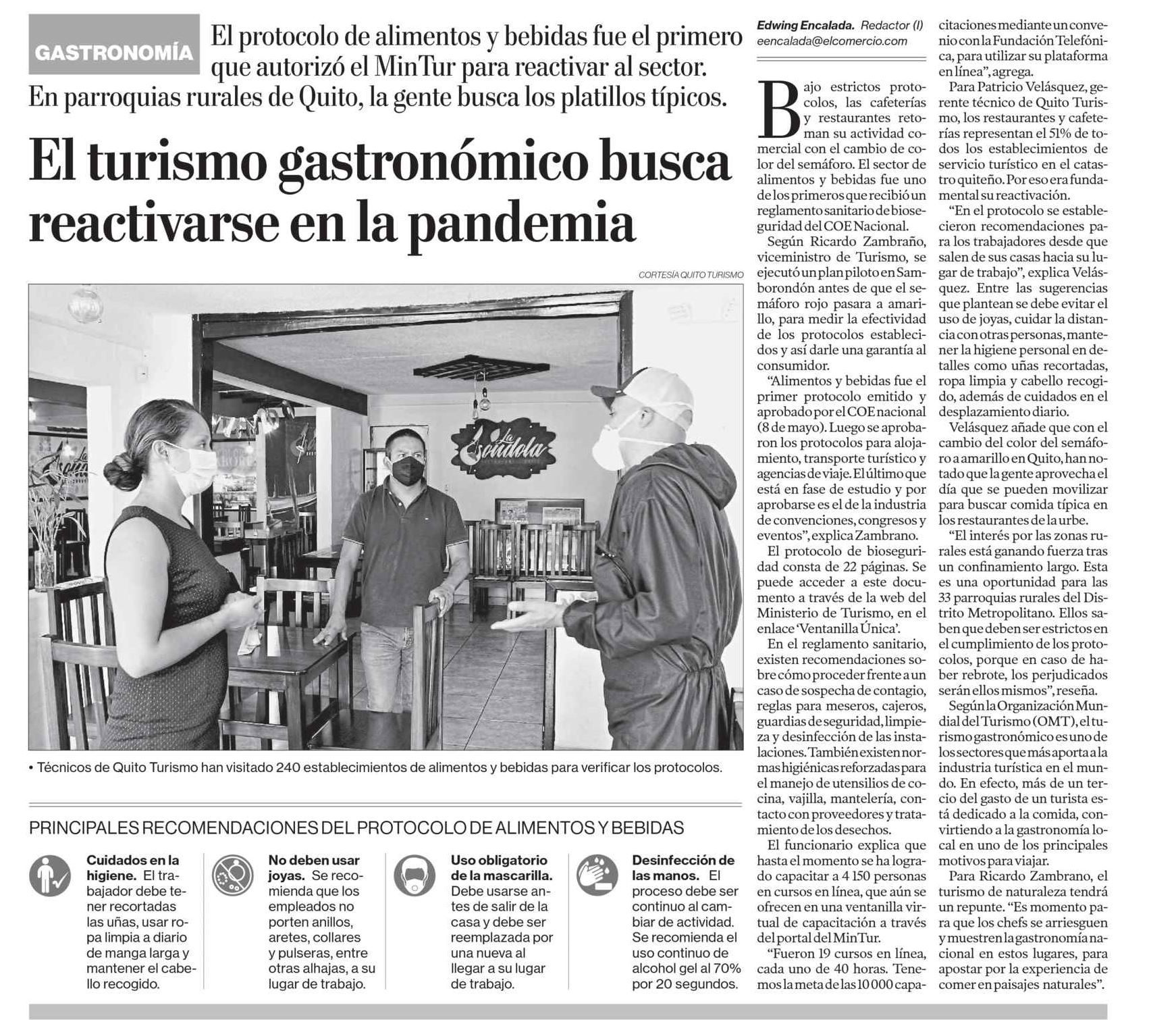 Fecha: 8 de junio de 2020 Medio: El Universo Descripción: Una vez que Quito paso al semáforo amarillo los diferentes sectores productivos intentan reactivar sus actividades comerciales, uno de ellos son los establecimientos de alimentos y bebidas que fueron los más afectados en esta emergencia sanitaria. Con ese objetivo Quito Turismo realiza jornadas [...]