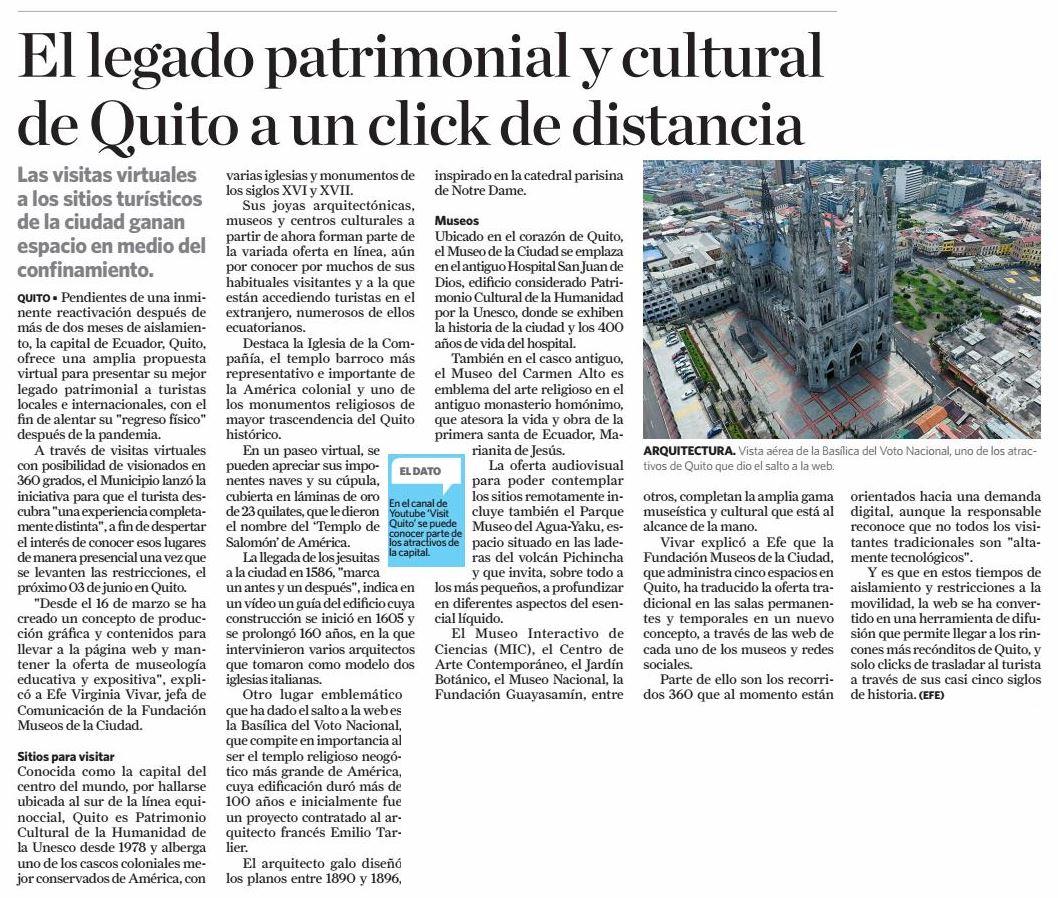 Fecha: 29 de mayo de 2020 Medio: La Hora Descripción: Las visitas virtuales a los sitios turísticos de la ciudad ganan espacio en medio del confinamiento. Quito, ofrece una amplia propuesta virtual para presentar su mejor legado patrimonial a turistas locales e internacionales, con el fin de alentar su "regreso físico" después de la [...]