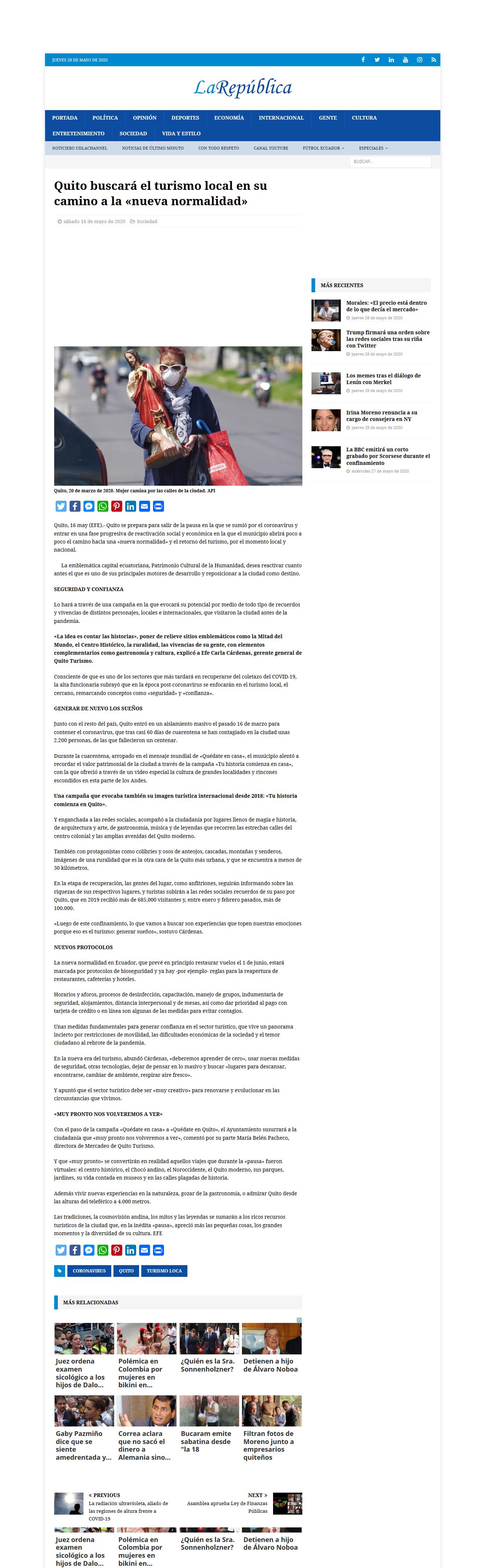 Fecha: 28 de mayo de 2020 Medio: La República Descripción: Quito se prepara para salir de la pausa en la que se sumió por el coronavirus y entrar en una fase progresiva de reactivación social y económica en la que el municipio abrirá poco a poco el camino hacia una "nueva normalidad" y [...]