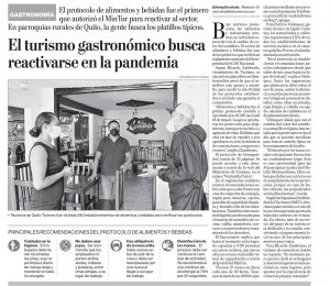 Descripción: Bajo estrictos protocolos, las cafeterías y restaurantes retoman su actividad comercial con el cambio de color del semáforo. El sector de alimentos y bebidas fue uno de los primeros que recibió un reglamento sanitario de bioseguridad del COE Nacional. Para Patricio Velásquez, gerente técnico de Quito Turismo, los restaurantes y cafeterías representan el 51% de todos los establecimientos de servicio turístico en el catastro quiteño. Por eso era fundamental su reactivación.