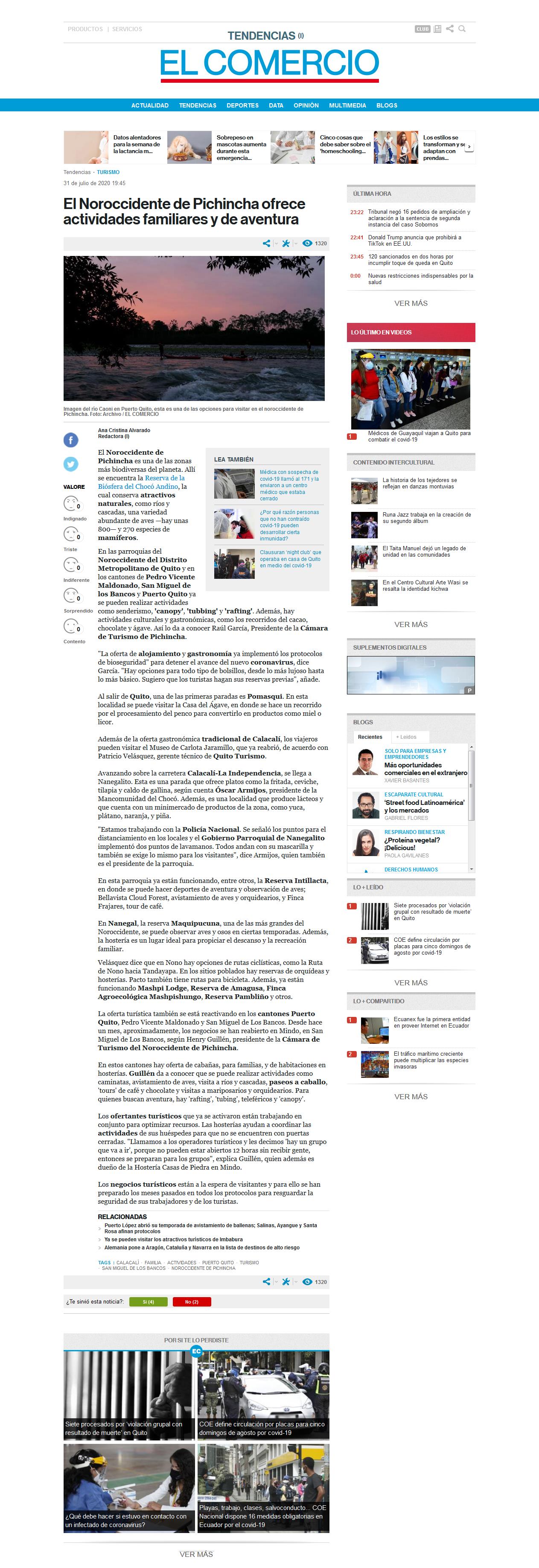 Fecha: 31/07/2020 Medio: El Comercio Descripción: El Noroccidente de Pichincha es una de las zonas más biodiversas del planeta. Allí se encuentra la Reserva de la Biósfera del Chocó Andino, la cual conserva atractivos naturales, como ríos y cascadas, una variedad abundante de aves —hay unas 800— y 270 especies de mamíferos. En las [...]