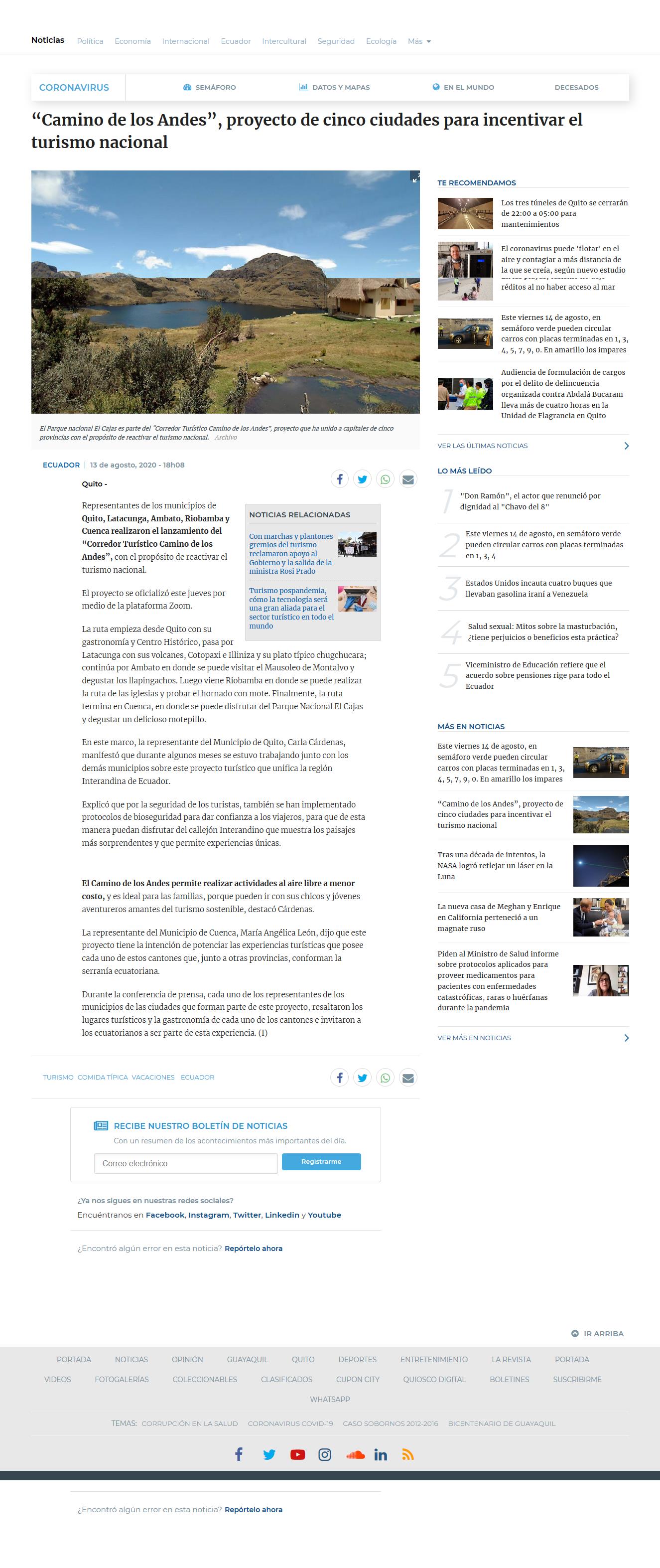 Fecha: 13/08/2020 Medio: El Universo Descripción: Representantes de los municipios de Quito, Latacunga, Ambato, Riobamba y Cuenca realizaron el lanzamiento del "Corredor Turístico Camino de los Andes", con el propósito de reactivar el turismo nacional. El proyecto se oficializó este jueves por medio de la plataforma Zoom.