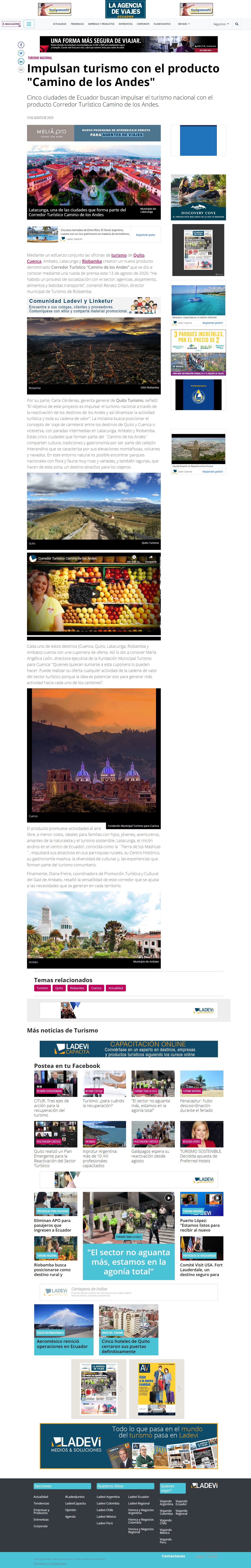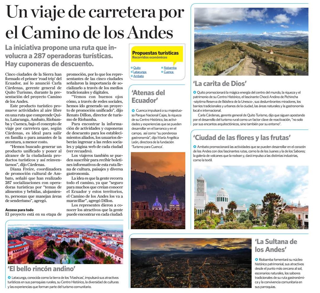 Fecha: 15/09/2020 Medio: Ladevi Ecuador Descripción: Mediante un esfuerzo conjunto las oficinas de turismo de Quito, Cuenca, Ambato, Latacunga y Riobamba crearon un nuevo producto denominado Corredor Turístico "Camino de los Andes" que se dio a conocer mediante una rueda de prensa este 13 de agosto de 2020.