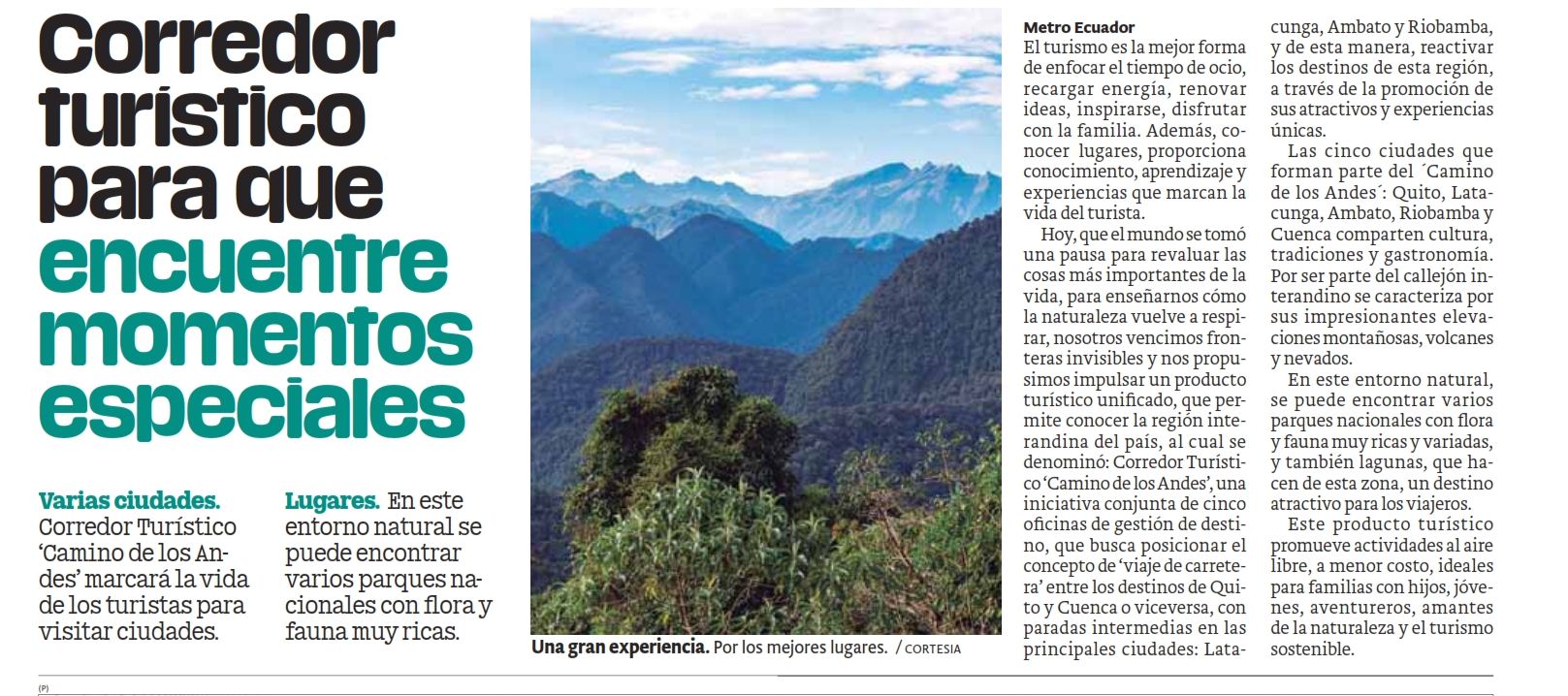 Fecha: 17/08/2020 Medio: Metroecuador Descripción: Producto turístico unificado, que permite conocer la región interandina del país, al cual se denominó: Corredor Turístico ‘Camino de los Andes’, una iniciativa conjunta de cinco oficinas de gestión de destino, que busca posicionar el concepto de ‘viaje de carretera’ entre los destinos de Quito y Cuenca o viceversa, [...]