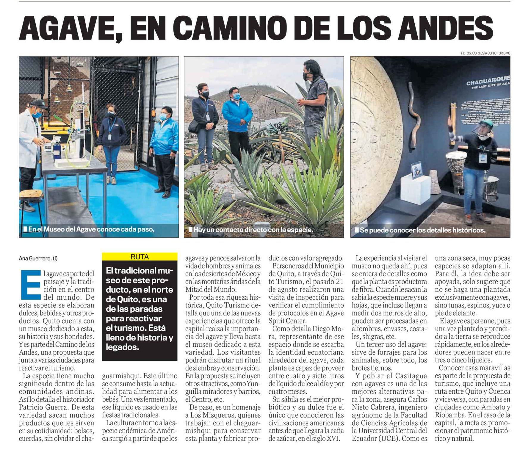 Fecha: 31 de agosto de 2020 Medio: Últimas Noticias Descripción: El agave es parte del paisaje y la tradición en el centro del mundo. De esta especie se elaboran dulces, bebidas y otros productos. Quito cuenta con un museo dedicado a esta, su historia y sus bondades. Y es parte del Camino de [...]