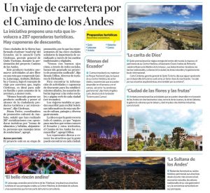 Descripción: Cinco ciudades de la Sierra han formado el primer ‘road trip’ del Ecuador, así lo anunció Carla Cárdenas, gerente general de Quito Turismo, durante la presentación del proyecto Camino de los Andes. Este producto turístico promueve actividades al aire libre en una ruta que comprende Quito, Latacunga, Ambato, Riobamba y Cuenca, bajo el concepto de viaje por carretera, ideal para salir en familia o para amantes de la aventura, a menor costo. «Hemos buscado generar un producto unificado y poner al alcance de la ciudadanía productos turísticos y así reinventarnos», dijo Cárdenas.