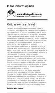 Descripción: La capital ecuatoriana alberga innumerables lugares y rincones por conocer y recorrer. Diferentes zonas de interés y para diversos tipos de turismo, convirtiéndolo en un destino de visita obligada, sólido por todo lo que ofrece al visitante. Con el objetivo de identificar toda la oferta de recreación existente en el Distrito Metropolitano, el Cabildo, a través de Quito Turismo, desarrolló una actualización de los atractivos, actividades, infraestructura y servidos, que permiten al viajero vivir la mejor experiencia.