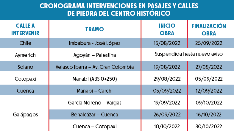 El Municipio de Quito, a través del Instituto Metropolitano de Patrimonio, en el marco del proceso «INTERVENCIÓN INTEGRAL PASAJES Y CALLES DE PIEDRA DEL CHQ IMP», se encuentra trabajando en obras de mantenimiento integral, especializado y preventivo para la recuperación y mejora de pasajes y calles de piedra que son consideradas de valor patrimonial y que, por el continuo uso vehicular, las circunstancias climáticas adversas, entre otras causas, se encontraban en malas condiciones, dificultando y afectando la movilidad de ciudadanos y automotores, usuarios de estas; trabajos que se realizaran durante los meses de agosto, septiembre y octubre, de acuerdo con el siguiente cronograma: