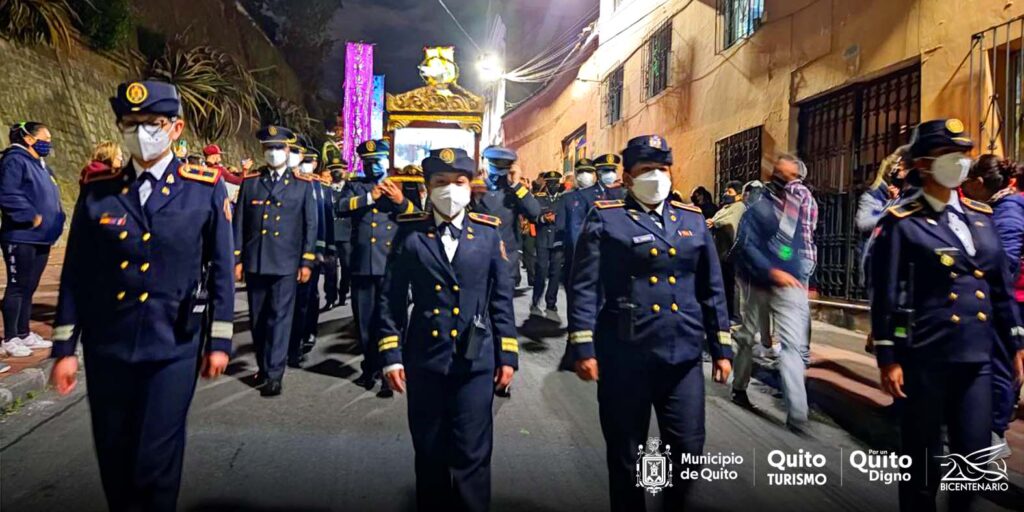 Las luces de los cirios alumbran la calle García Moreno, el Prioste, que carga una bandera de Jueves Santo, abre la procesión, a su costado van el engastador y las almas santas, además, de un acompañante. Todos ellos representan a los personajes que escoltan a Jesús hasta el Santo Sepulcro.