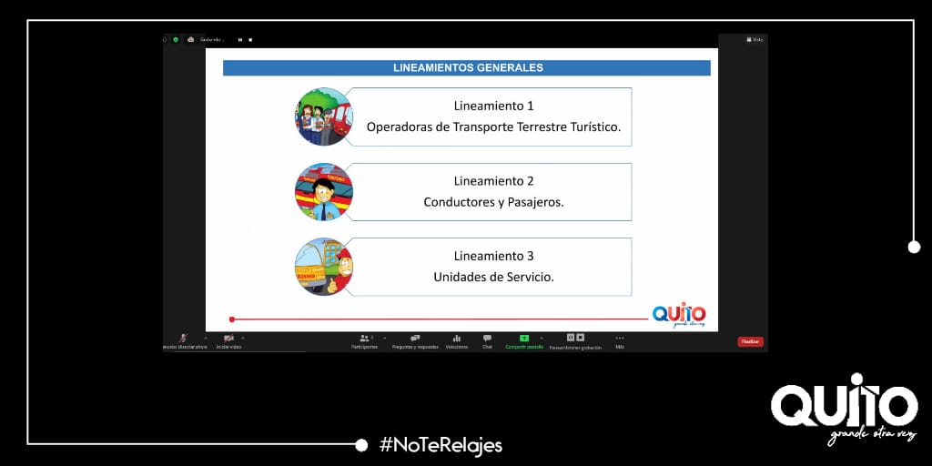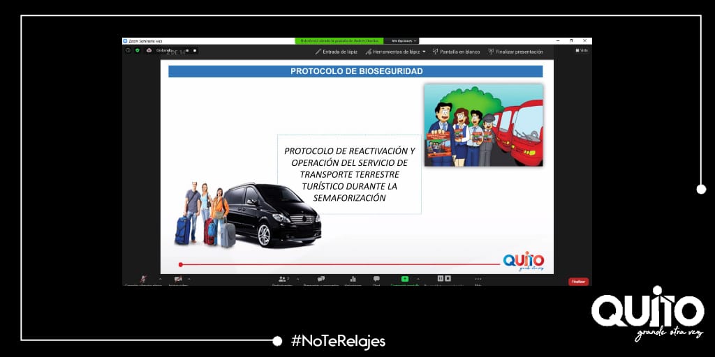 El cabildo quiteño, a través de la Empresa Pública Metropolitana de Destino Turístico – Quito Turismo, con el objetivo de fortalecer las capacidades de los operadores de turismo, para que ofrezcan servicios confiables, llevó adelante el primer evento de capacitación del 2021: Implementación de Protocolos de Bioseguridad para empresas de transporte turístico; temática que tiene lineamientos de ejecución para los siguientes grupos:
