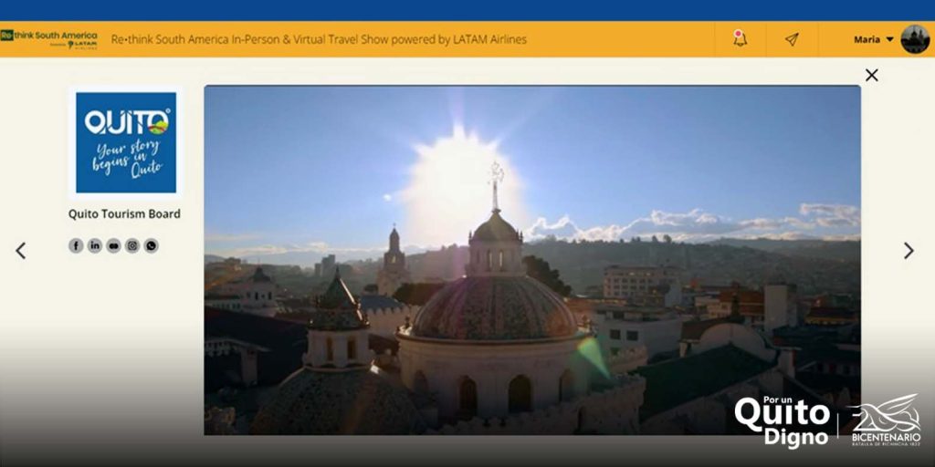 En ese marco, este 23 y 24 de febrero, Quito participó en Re-think South America 2022, un evento comercial especializado en viajes y turismo que reunió a los principales compradores de Estados Unidos para que descubran la oferta turística de la Capital del Centro del Mundo.