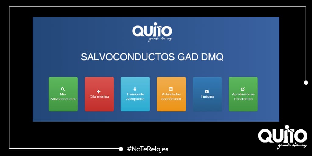 En el marco de reactivación productiva impulsada por el Municipio capitalino y con el afán de incentivar la visita responsable y segura al Distrito Metropolitano de Quito y, de esta forma, fomentar los viajes por carretera, en vehículos propios o transporte confiable se crea el botón de salvoconductos de turismo. Este botón estará vigente a partir del jueves 3 de diciembre, a través de la página web: pam.quito.gob.ec, opción salvoconductos.