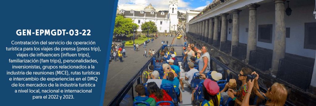 suscrita por María Cristina Rivadeneira R. en su calidad de Gerente General, se convoca a personas naturales y jurídicas, a que presente su oferta técnica y económica para la contratación del El objeto de la presente es la contratación del servicio de operación turística para los Viajes de Prensa (Press Trip), viajes de influencers (influen Trips), familiarización (Fam Trips), personalidades, inversionistas, grupos relacionados a la Industria de Reuniones (MICE), rutas turísticas e intercambio de experiencias en el DMQ de los mercados de la Industria turística a nivel local, nacional e internacional para el 2022 y 2023.